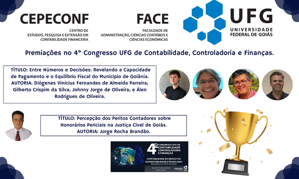 Novembro terminou com notícia boa para os membros do CEPECONF: tivemos duas pesquisas premiadas entre as melhores do 4o. Congresso UFG de Contabilidade Controladoria e Finanças, realizado nos dias 27 e 28 de novembro.